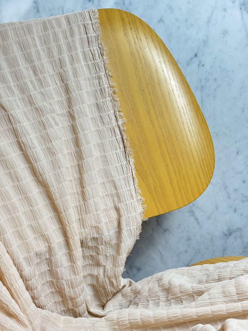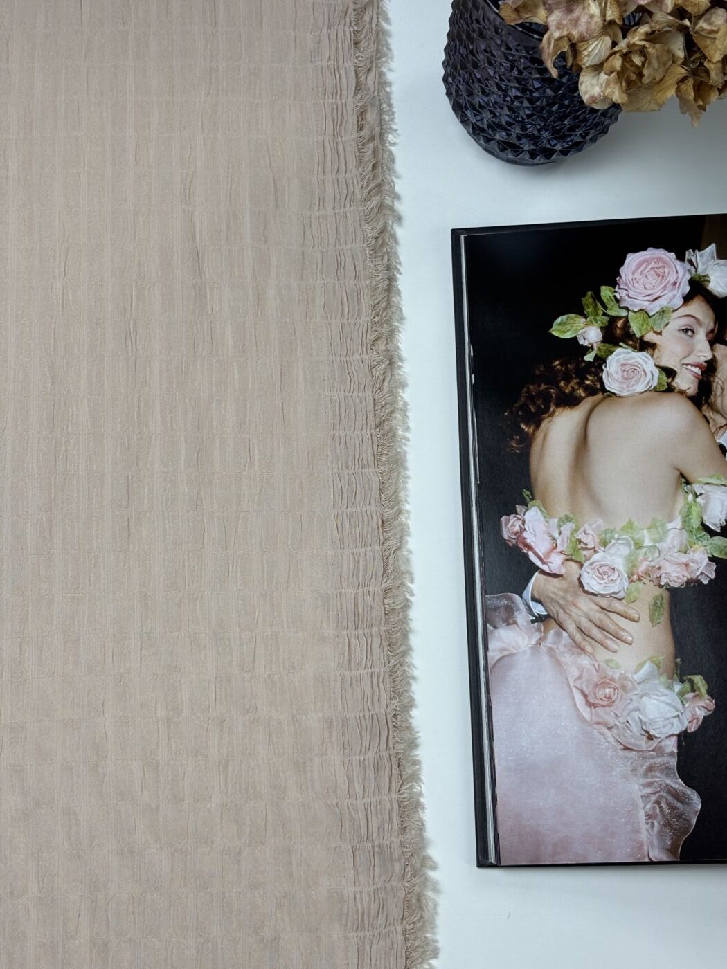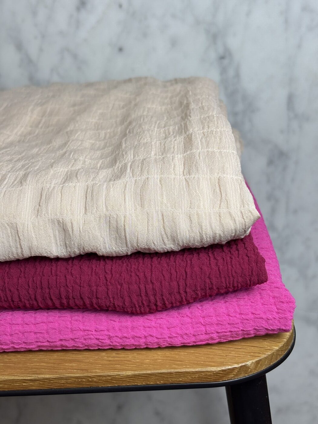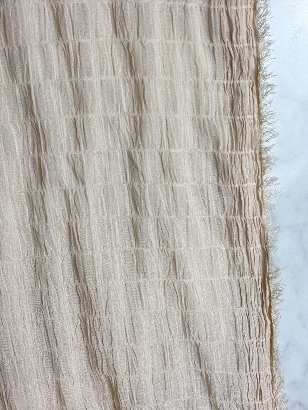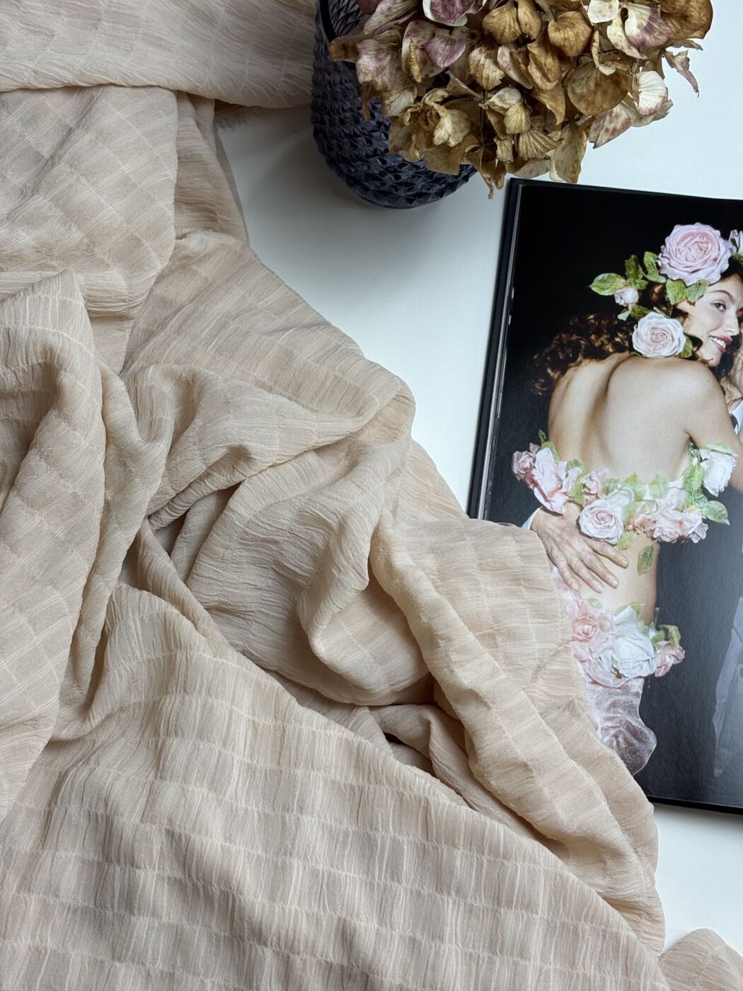 Découvrez notre box de tissu DARLA, un magnifique crêpe jacquard d’une douceur et d’une légèreté incomparables. Son coloris nude met en lumière sa texture crinkle unique, caractérisée par un effet froissé subtil et un relief tissé très délicat.