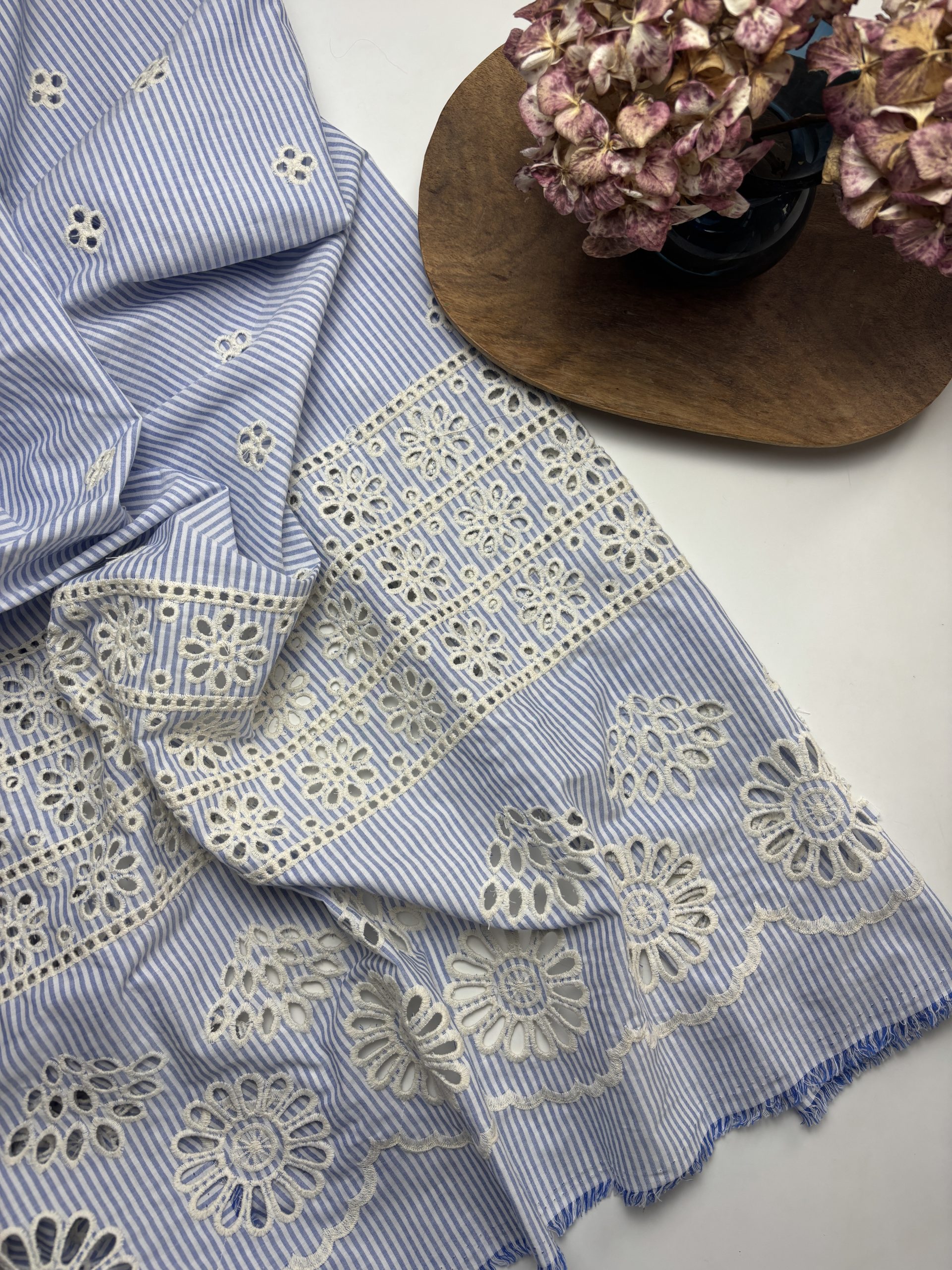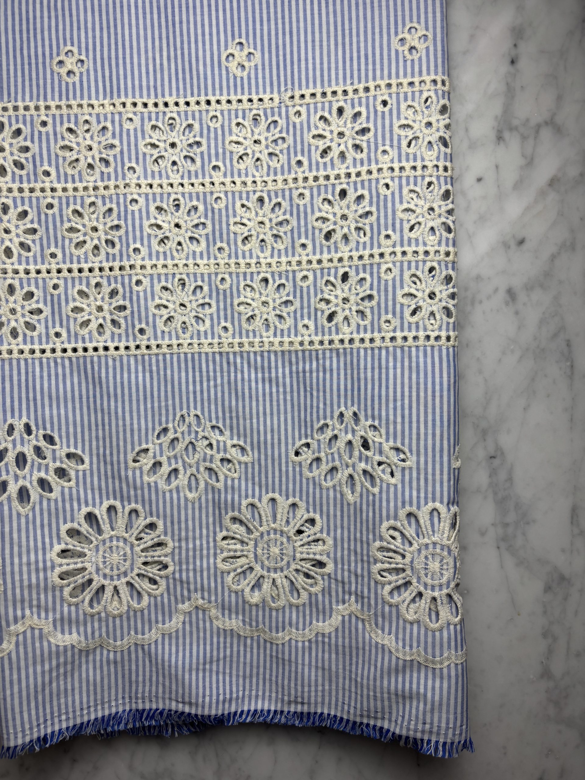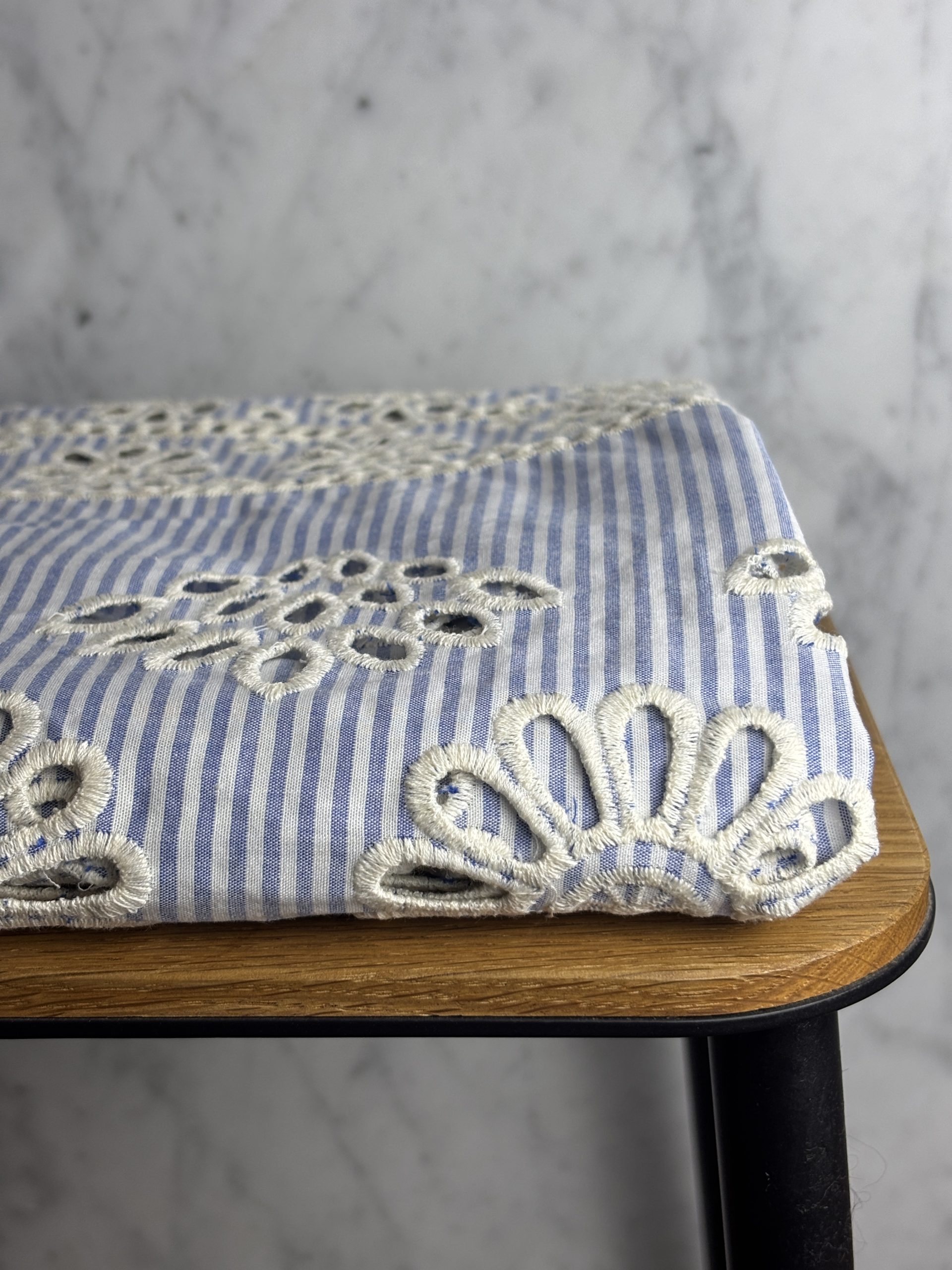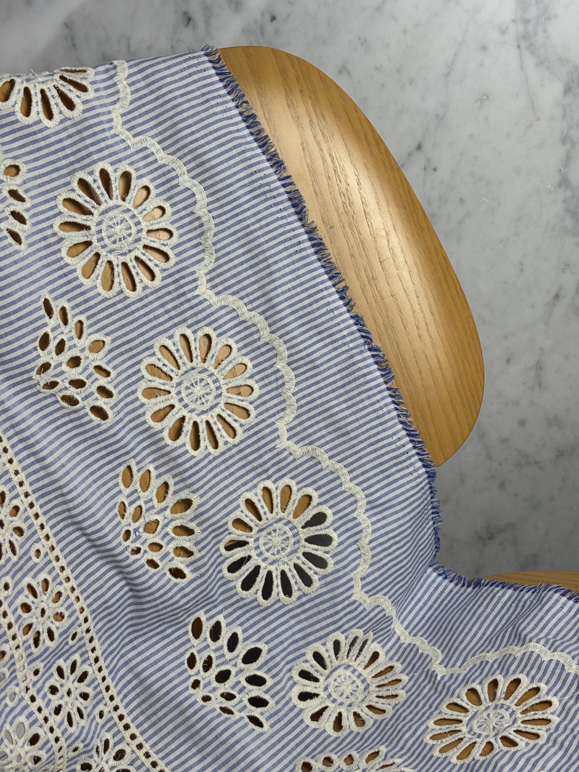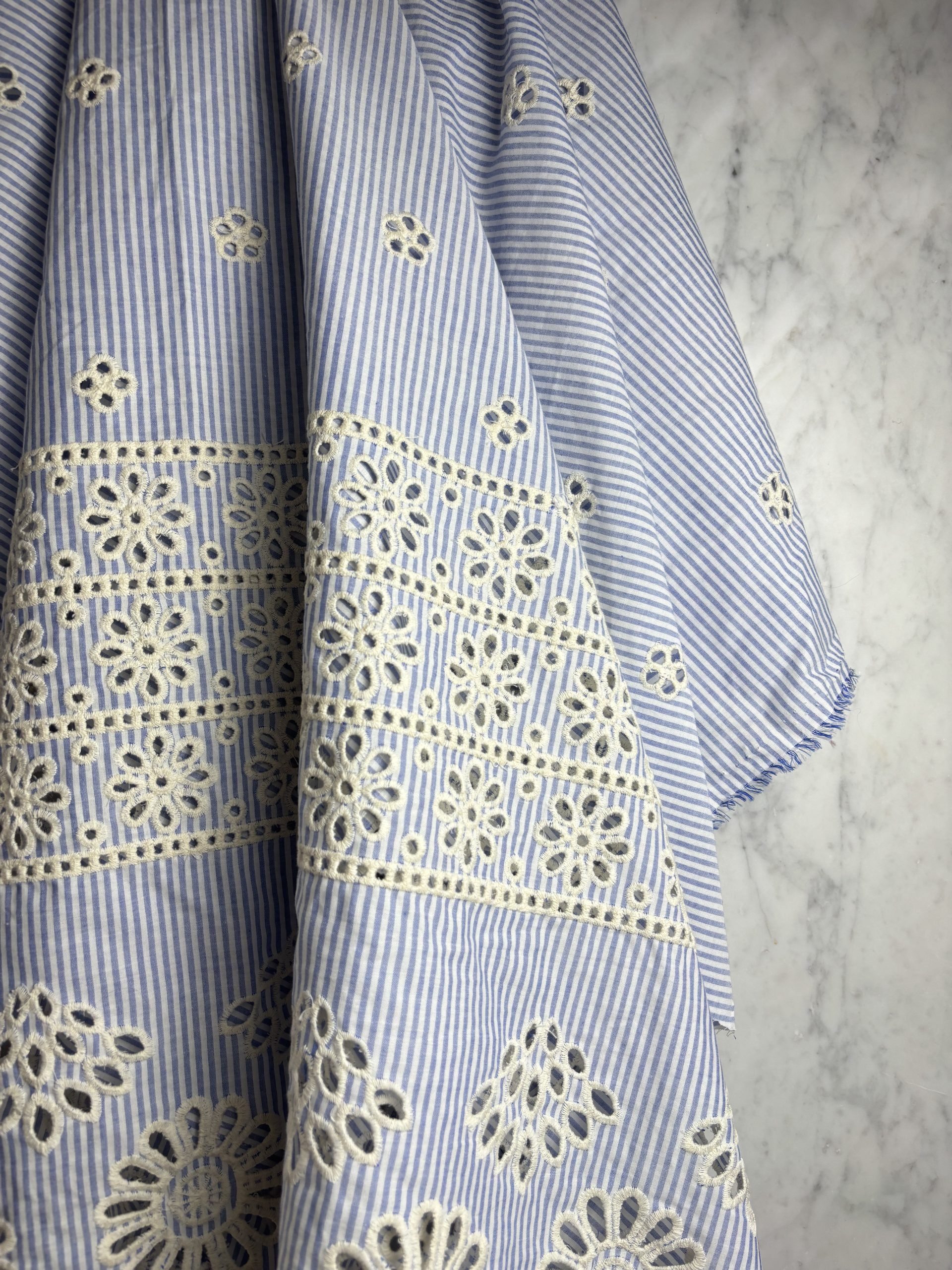 Tissu DEVA – Broderie anglaise festonnée sur rayure bleu ciel & blanc