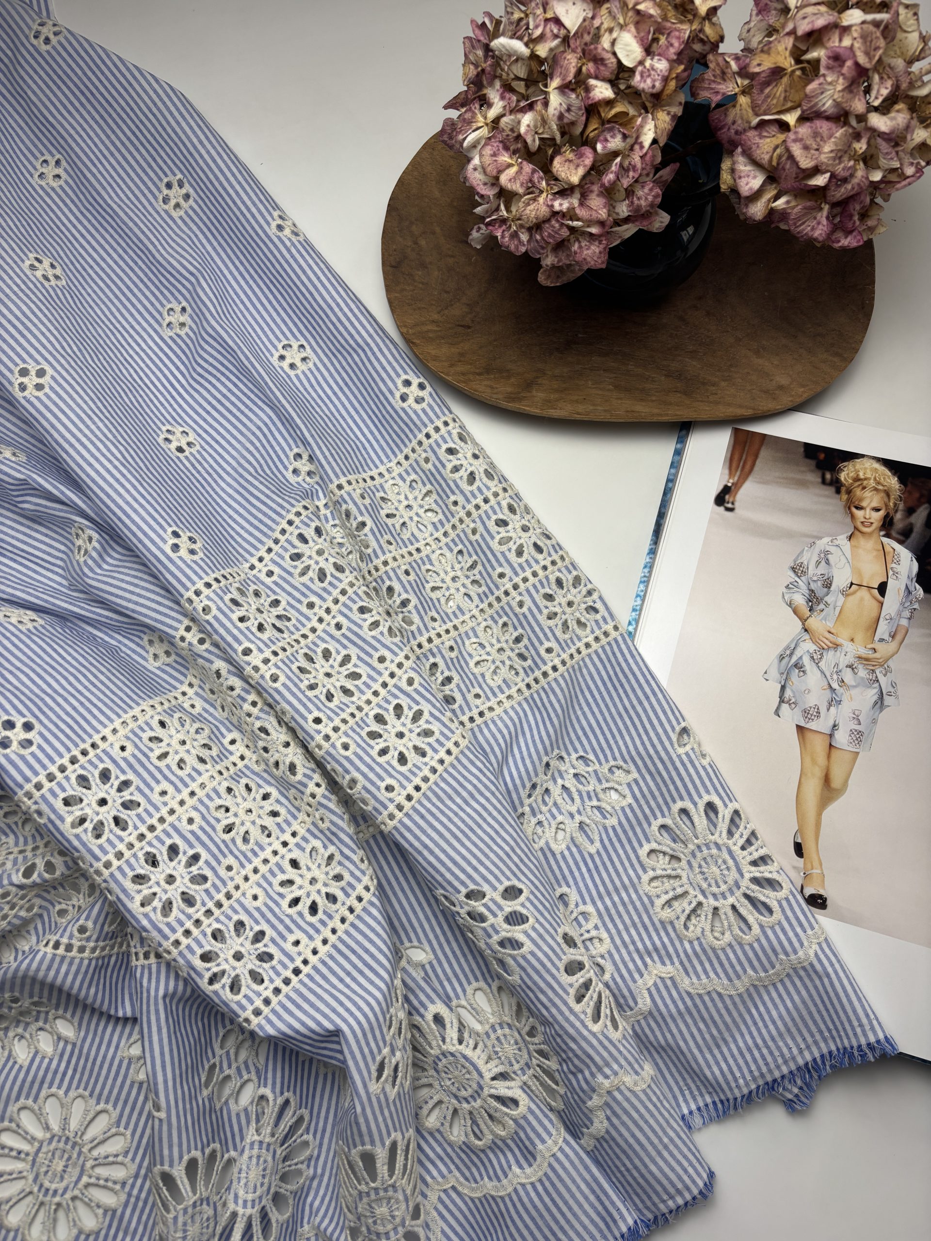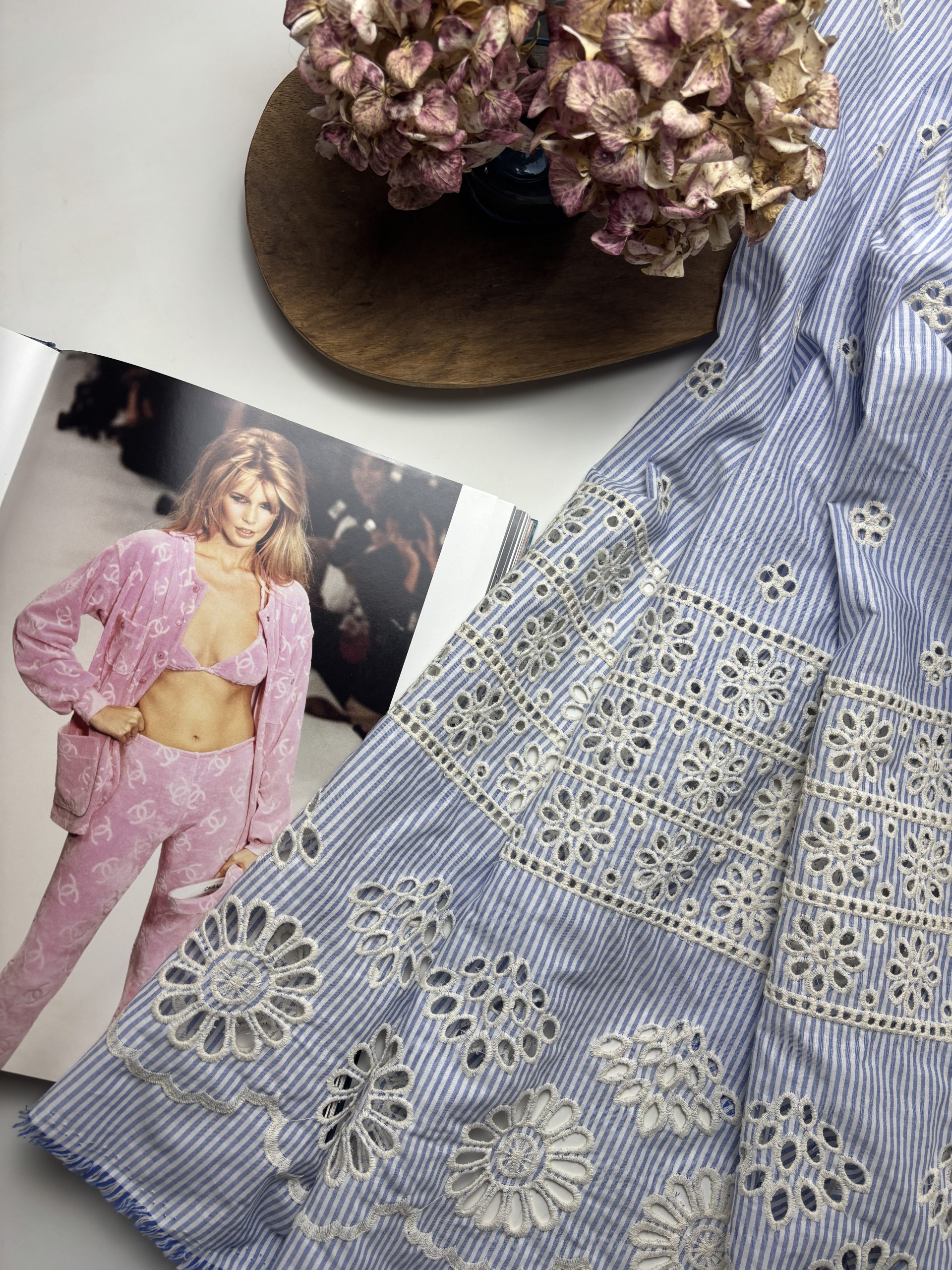 Découvrez la nouvelle pièce phare de la saison : une broderie anglaise d’exception qui marie avec élégance une délicate rayure « oxford » bleu ciel et blanc à la douceur d’un travail ajouré minutieux.