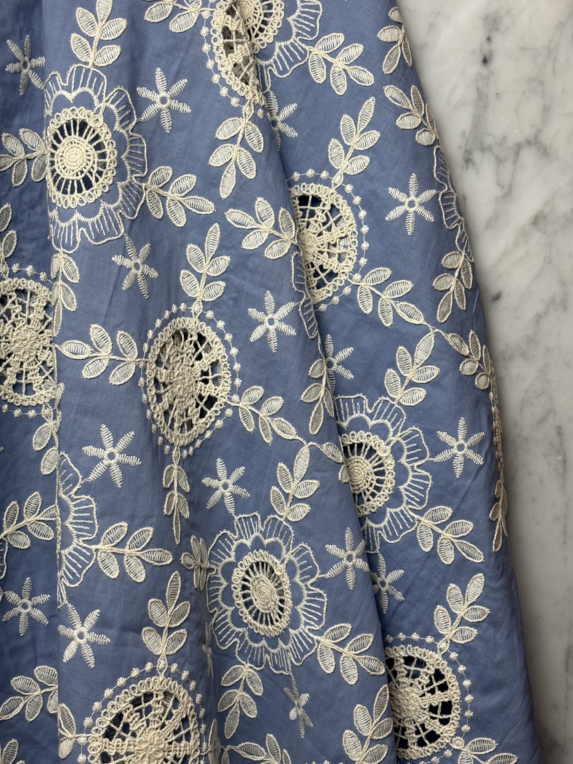 – la broderie anglaise qui dessine des feuillages et des fleurs au point de chaînette,
