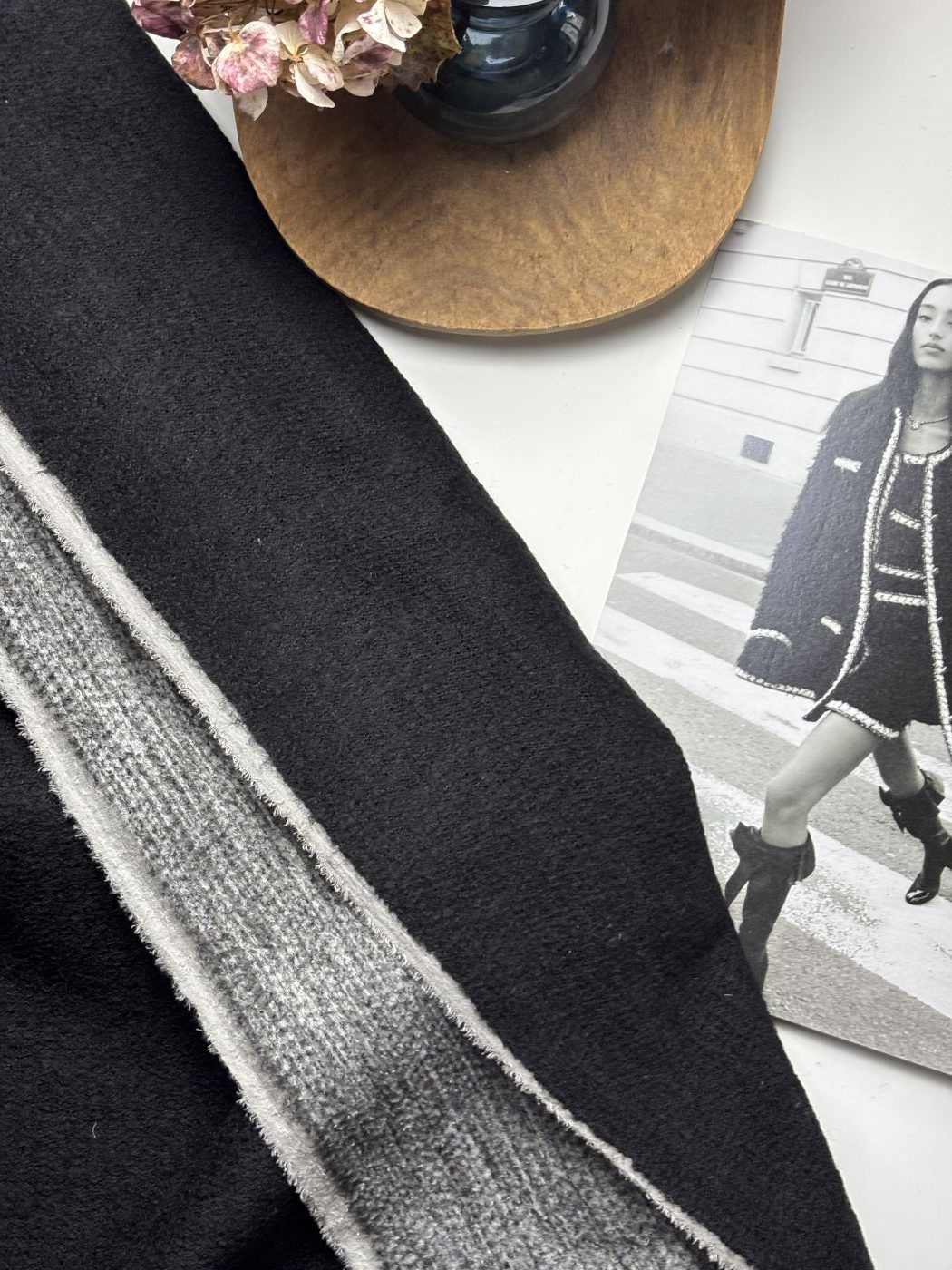 👉Désignation Coupon Jodie : Laine double face / Recto noir uni / Verso gris chiné  / Métrage : 2 mètres