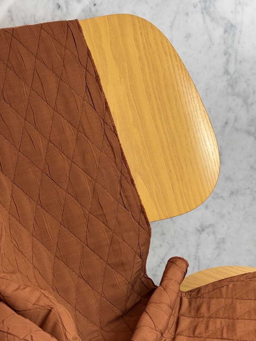 Une matière qui conjugue allure et technicité. Oxford, notre jacquard matelassé en polyester recyclé, revisite le classique effet losange avec un relief graphique et élégant.
