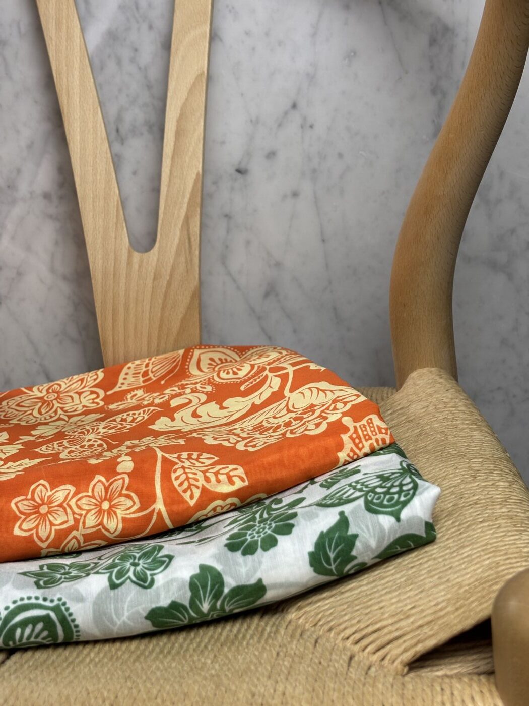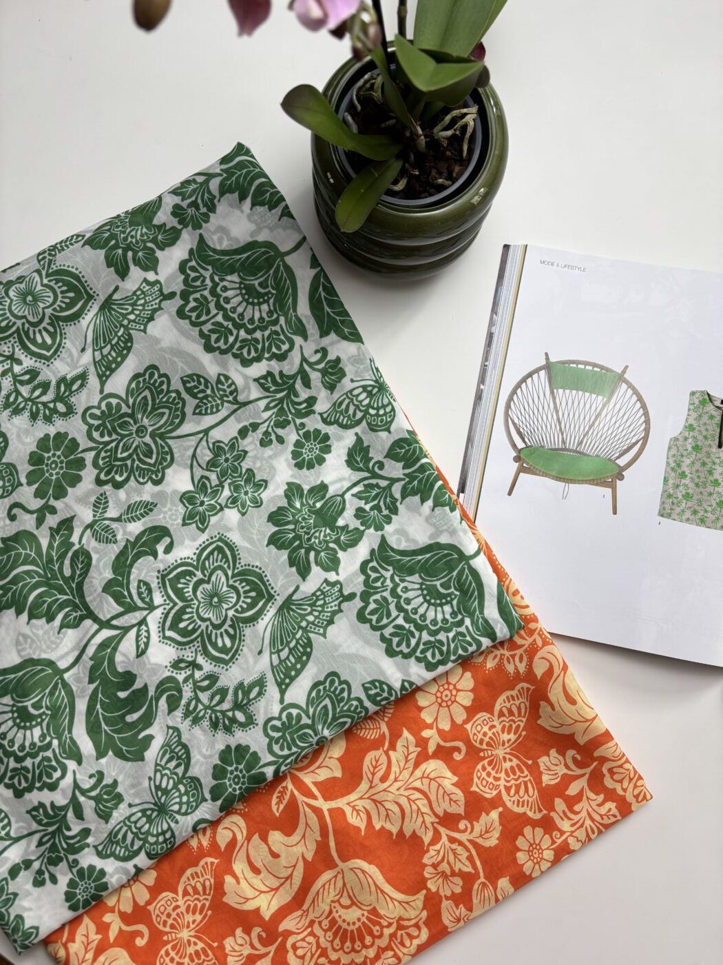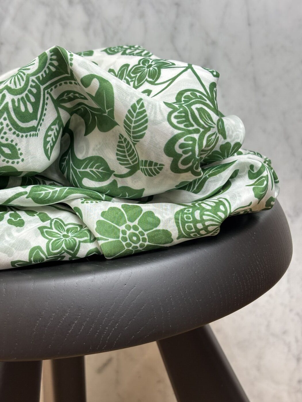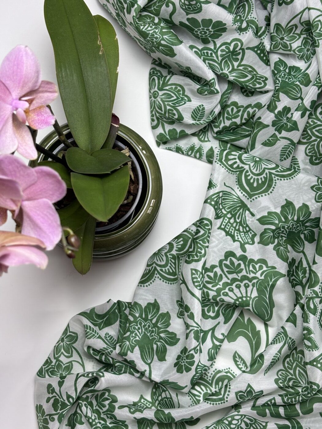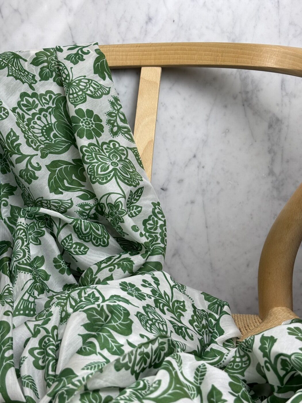 Laissez-vous séduire par la délicatesse du tissu Tiphaine, une merveille en voile de coton soie proposée en coupon de 3 mètres. Son fond écru délicat est rehaussé de motifs verts, entre fleurs stylisées et silhouettes de papillons graphiques.