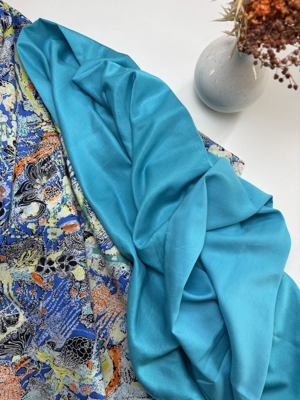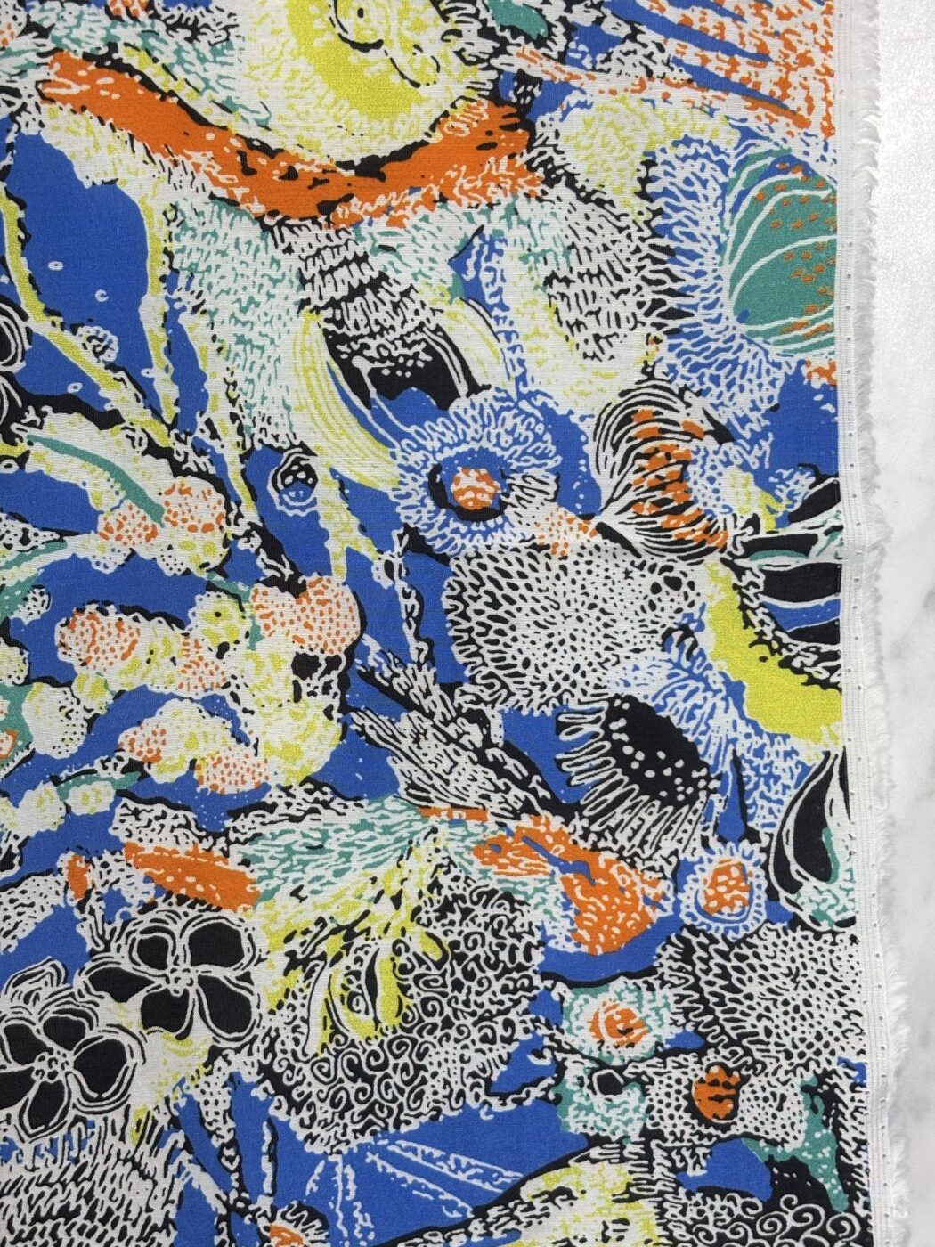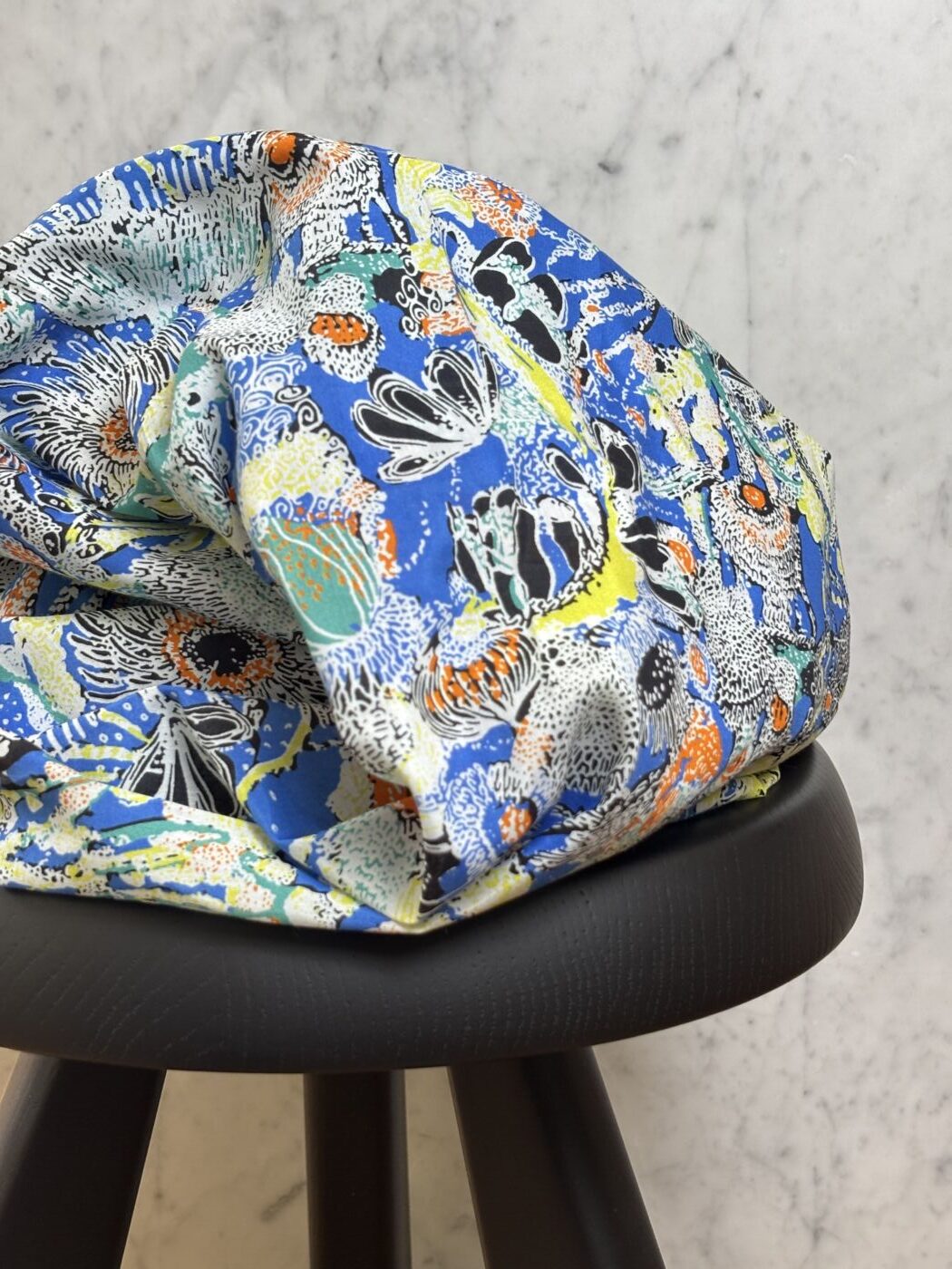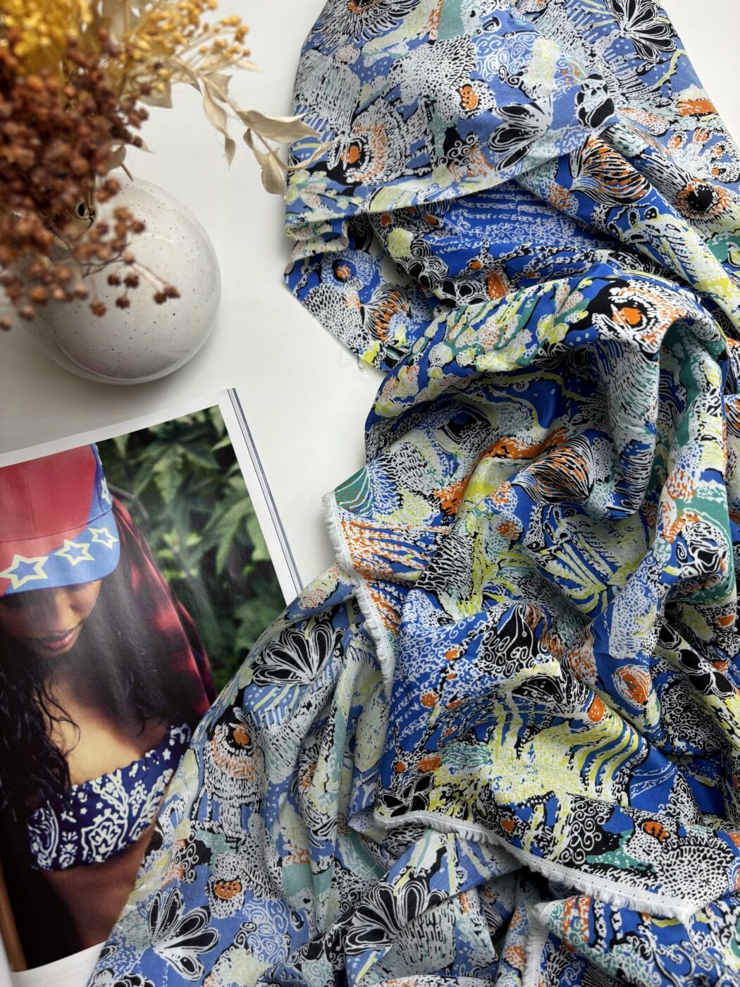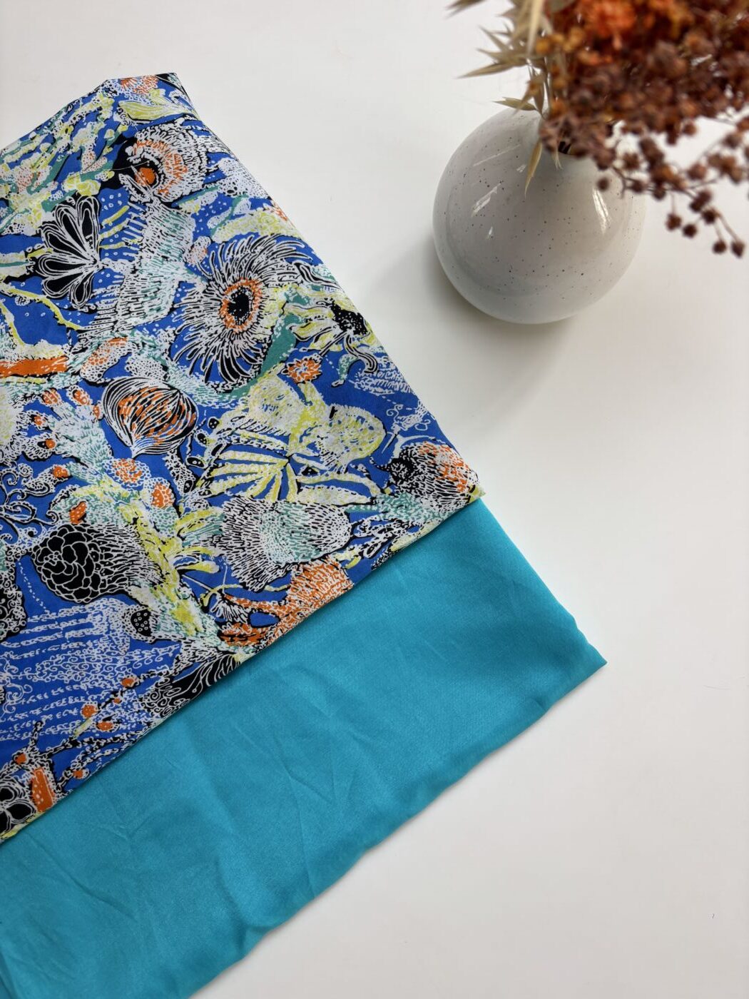 Laissez-vous emporter par la richesse du motif Vaiana, une explosion de couleurs intenses et de détails foisonnants imprimés sur un voile de coton soie au tombé vaporeux. Bleu électrique, jaune citron, orange vif et touches d’encre noire composent un paysage graphique vibrant, entre jungle imaginaire et flore stylisée.