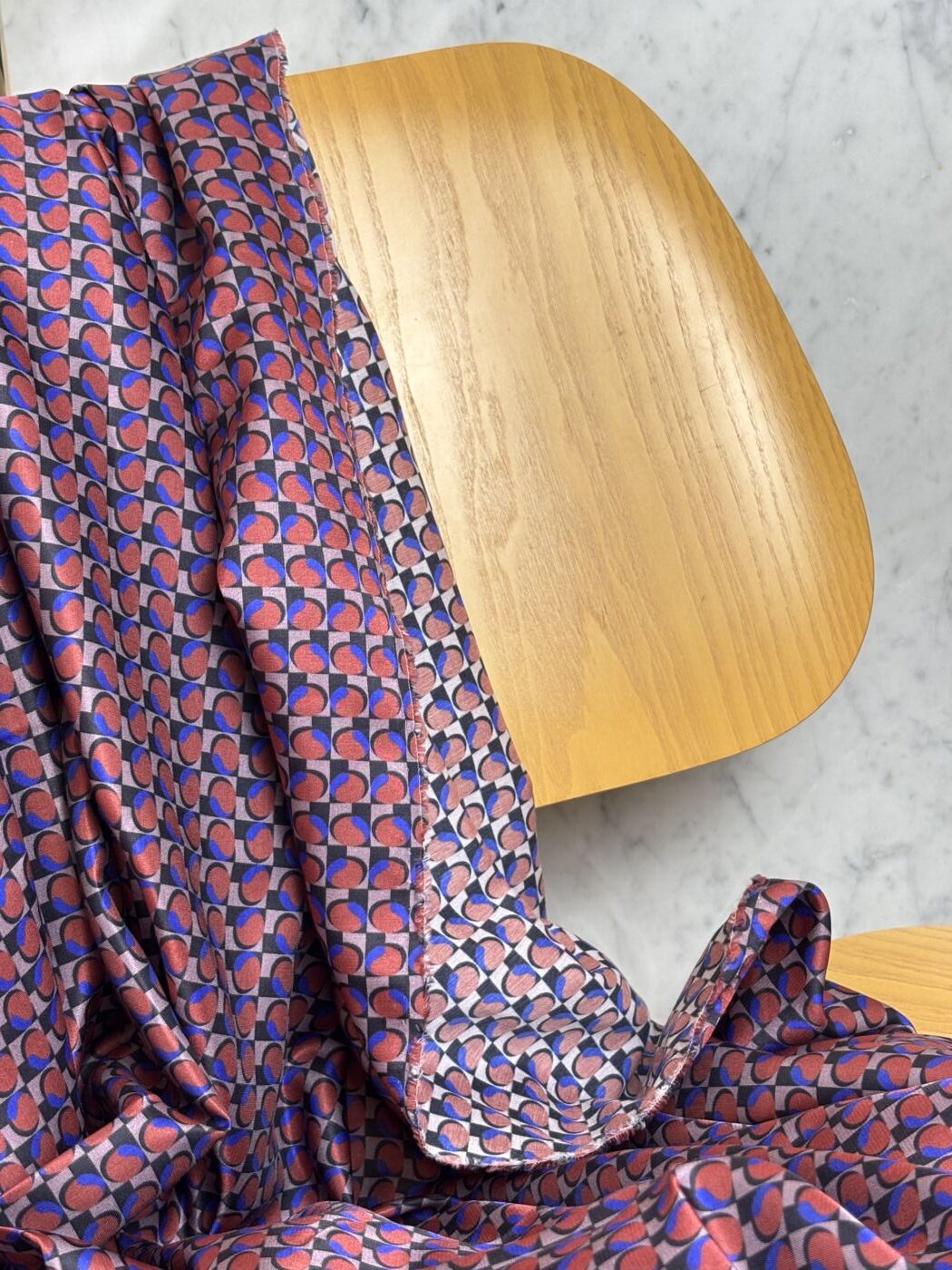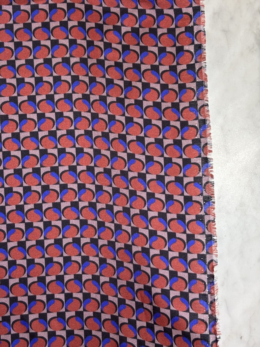 Son motif géométrique aux accents rétro, décliné dans un jeu de teintes automnales – brique, bleu électrique et noir profond – lui donne une allure graphique et affirmée, tout en restant facile à porter.